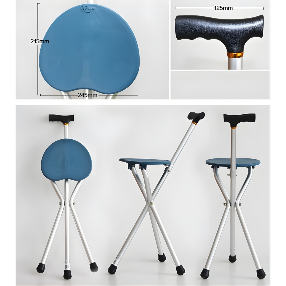 Baston ortopedic cu scaun pliabil realizat din aluminiu ușor, cu trei picioare antiderapante și scaun din PVC, oferind stabilitate și confort pentru odihnă în timpul plimbărilor.