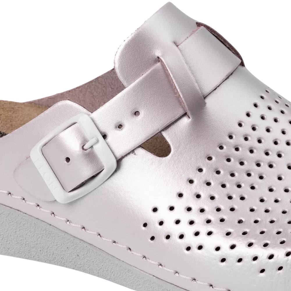 Saboții profesionali Leon 5001 Perla sunt confecționați din piele naturală 100%, oferind o combinație ideală între eleganță și funcționalitate medicală. Aceștia dispun de un branț detașabil cu gel și memorie pentru amortizarea șocurilor și perforații strategice care asigură o ventilație optimă pe parcursul întregii zile.